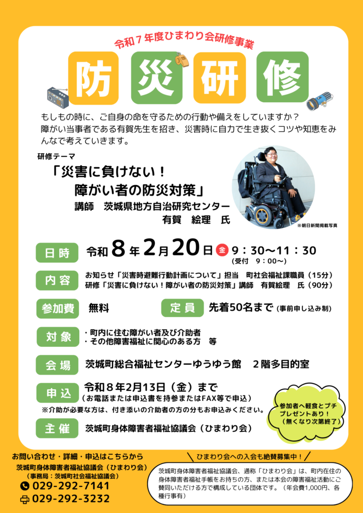 令和8年2月20日(金)に茨城町身体障害者福祉協議会(ひまわり会)主催の防災研修を茨城町総合福祉センターゆうゆう館にて行います。本研修は、ひまわり会員以外の方もご参加いただける内容となっておりますので、是非多くの方のご参加お待ちしております。